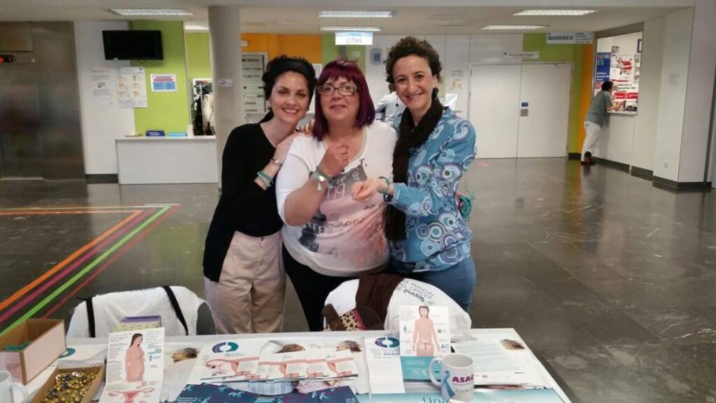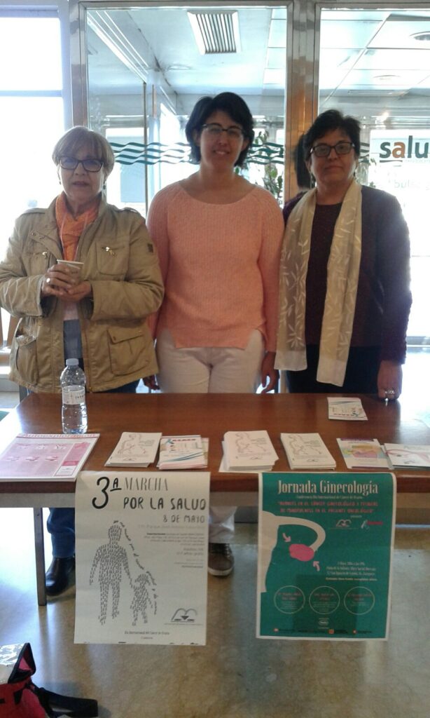 Parte del Grupo de Apoyo de Cantabria dando visibilidad al cáncer de ovario en el DMCO. Mesa Informativa desde el Hospital Universitario Marqués de Valdecilla.